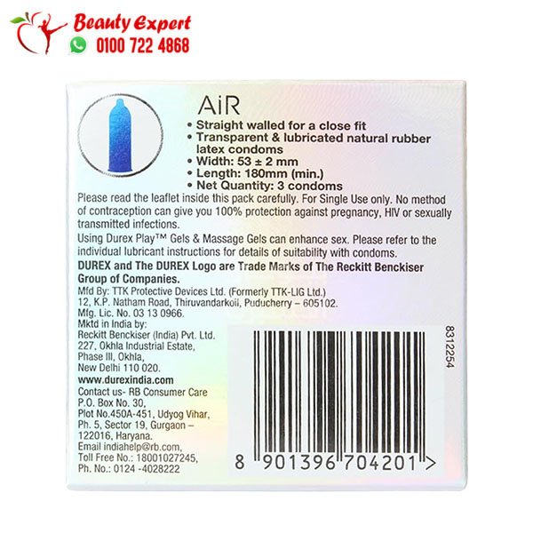 يمكنك شراء منتجات السعادة الزوجية من موقعنا والحصول على Durex Air Ultra Thin Condom بسعر 150 جنيه مصري فقط مع ضمان الجودة الأصلية وتوصيل سريع وسري حتى باب المنزل.